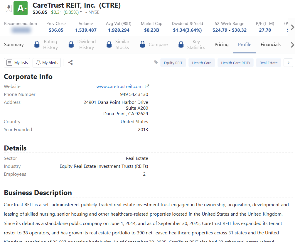 CareTrust REITは、米国および英国に所在する介護付き高齢者用住宅、高齢者向け住宅、その他のヘルスケア関連施設の所有、取得、開発、およびリースを行う、自己管理型の公開不動産投資信託です。2014年6月1日に独立した上場企業として設立されて以来、2025年9月30日現在、CareTrust REITはテナントを38の事業者に拡大し、不動産ポートフォリオは31州および英国に390の純リース済みヘルスケア施設(稼働ベッド数35,687床/ユニット)にまで拡大しています。 2025年9月30日現在、CareTrust REITは、17州および英国にまたがる143の医療施設(稼働中のベッド数/ユニット数14,082)に関連する23のその他の不動産関連投資と、1つの州にある46の施設(稼働中のベッド数/ユニット数3,820)に関連する1つの融資債権も保有していました。