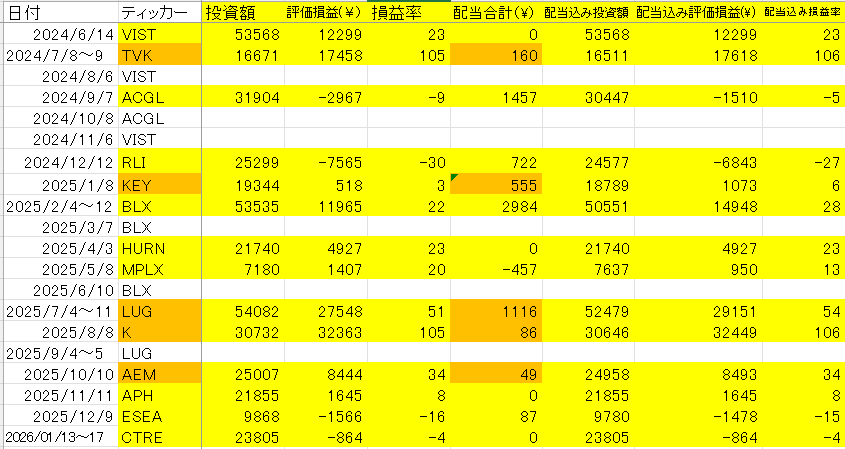 • 2026/1/13に37.51USDで3株購入(約1.7万円分)、2026/1/18に37.50USDで1株購入(約4千円分)